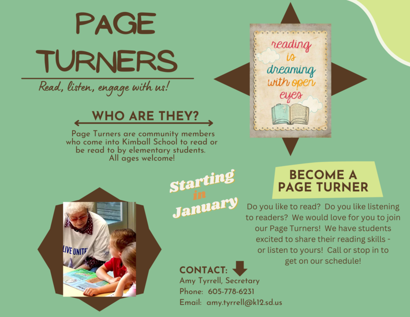 Kimball Elementary and Grass Ranch Elementary are excited to announce the Page Turner program! Our students are eager to share their reading skills or listen to yours! Grades JK-4th are in the program and now they just need you! Interested Page Turners can call or stop in the office to have their name added to our program. We will have a schedule of times, dates and ages you can choose from to come in for students to read to you or you read to them. It's up to you how often you join us.