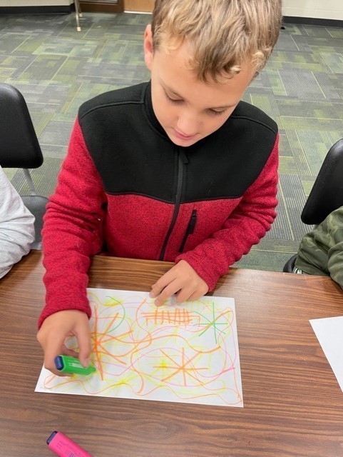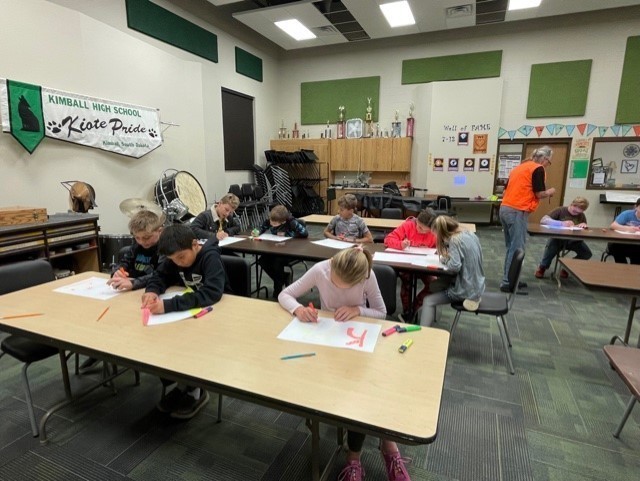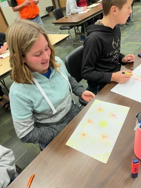 Bob H. Miller is our Artist in Residence this week working with students in grades JK-6th. His specialty is Black Light Art (making art that fluoresces under an ultraviolet light using drawing, painting and paper collage projects.) His residency is paid in part by the SD Arts Council.
