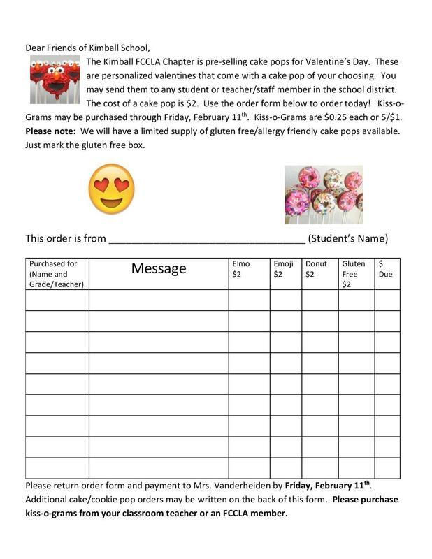 FCCLA is selling Cake Pops and Kiss-O-Grams for students and staff! This is a fundraiser for FCCLA and a great way to send a Valentine to anyone in the building or at the colony. Below is the order form or you can pick one up in the office. Thank you for your support!