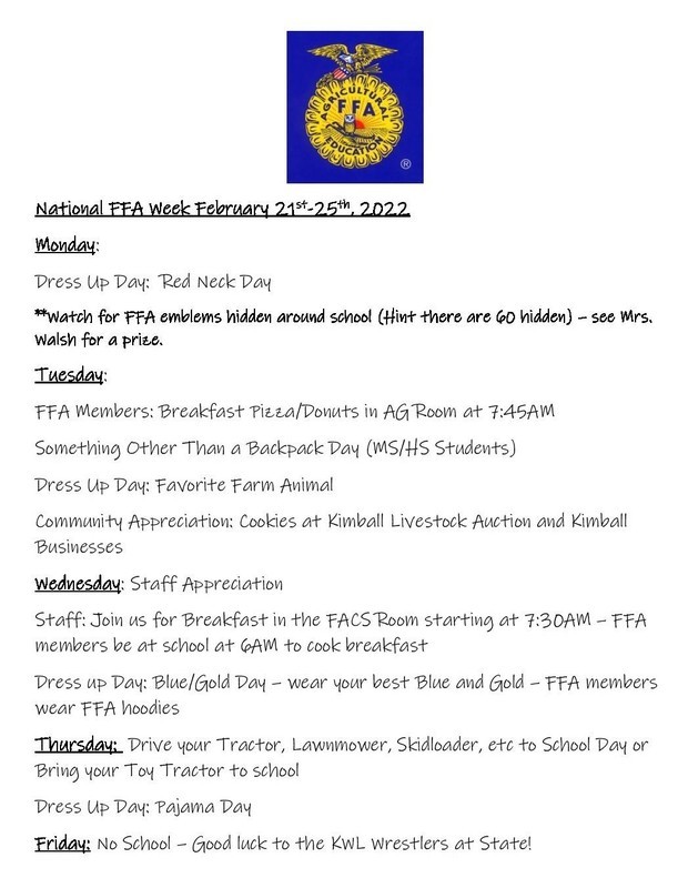 The Kimball FFA Chapter has dress up days and special activities to celebrate FFA Week, which is February 19-26. Please see the picture below for a schedule of activities: