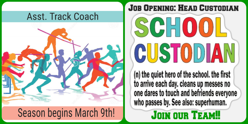 Immediate opening for Assistant Track Coach and opening this spring for Head Custodian. Please submit application from the webpage or stop on in!