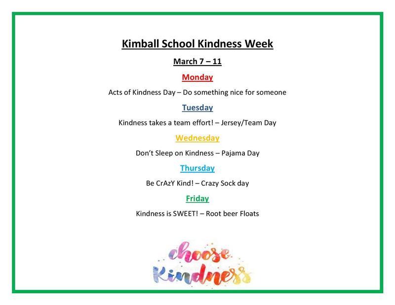 March 7-11 is Kindness Week at Kimball School. Check out the picture below to see how we are hoping to highlight kindness at Kimball School!