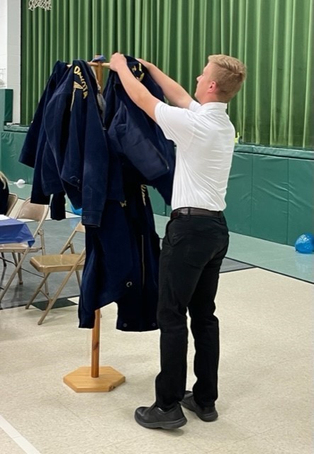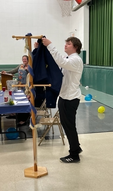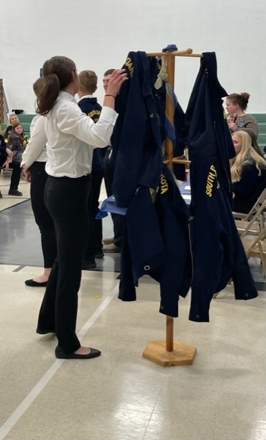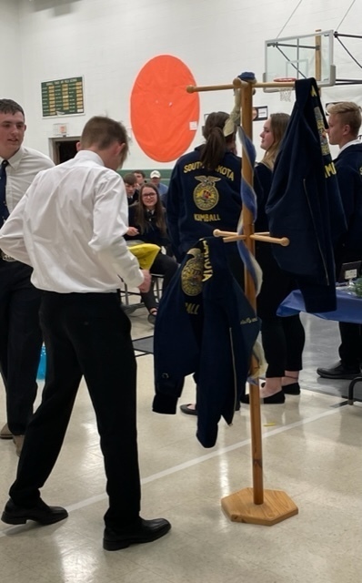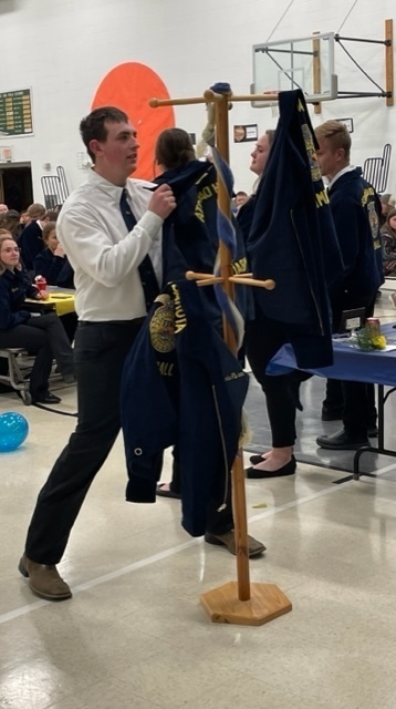 FFA hosted their Annual Banquet Monday night in the Den. Current President, Swayze Ness, opened the meeting and a potluck meal was then enjoyed by all who attended. Following the meal the meeting resumed with presentation of awards. Seniors then "hung up" their FFA jackets for the final time and were issued an FFA rope to wear at graduation. New officers were announced at the conclusion.